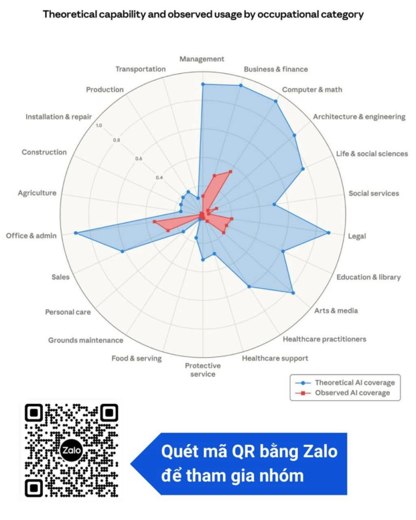AI có thể thay thế đến 90% công việc liên quan đến kinh doanh (business) nhưng hiện nay AI của Anthropic (Claude) mới xử lý có 30%. Khi các doanh nghiệp áp dụng AI ngày càng nhiều thì AI sẽ xử lý ngày càng nhiều công việc liên quan đến kinh doanh. Đây là số liệu trong một báo cáo mới ra của Anthropic (hình).
